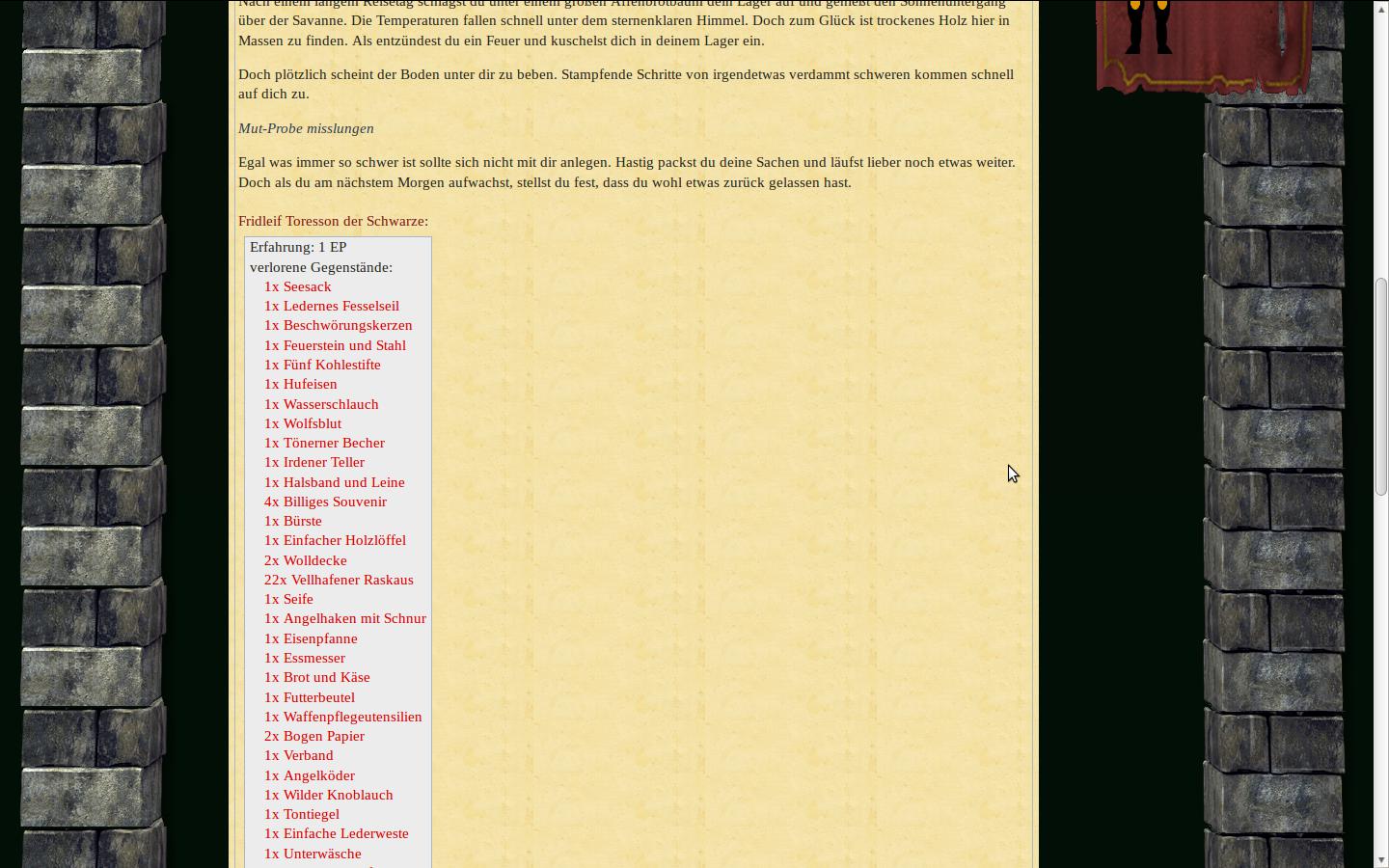Mir sind schon am ersten oder 2ten Tag -auf unglückliche Weise- in der Stadt 150 Gulden abhanden gekommen. Ich weiß gerade echt nicht mehr, wie ich meinen Helden vorm Hungertod noch retten könnte...