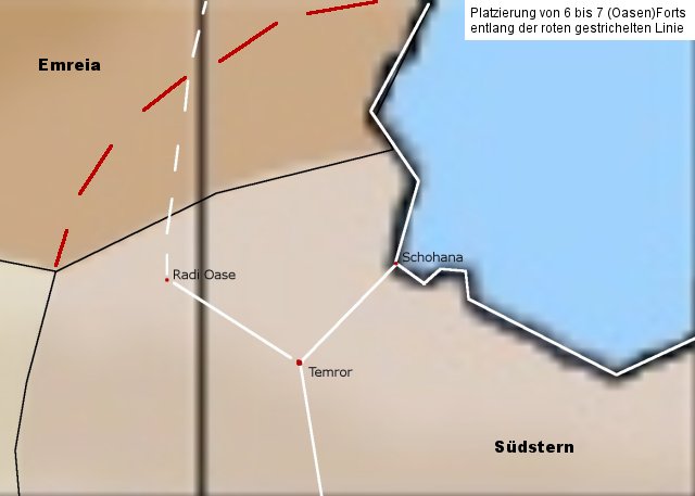 Das einzige was man dann beachten sollte wäre noch dass die Forts nicht zuweit auseinanderliegen und auch nicht allzuweit von der Grenze entfernt sein sollten. So bieten sie einen zu versorgenden Schutzwall, der zwar viel in der Unterhaltung kostet und auch nicht unangreifbar ist durch die Lage an einigen kleinen Oasen, gleichzeitig aber hat man einen guten Startpunkt für eigene militärische Aktionen.