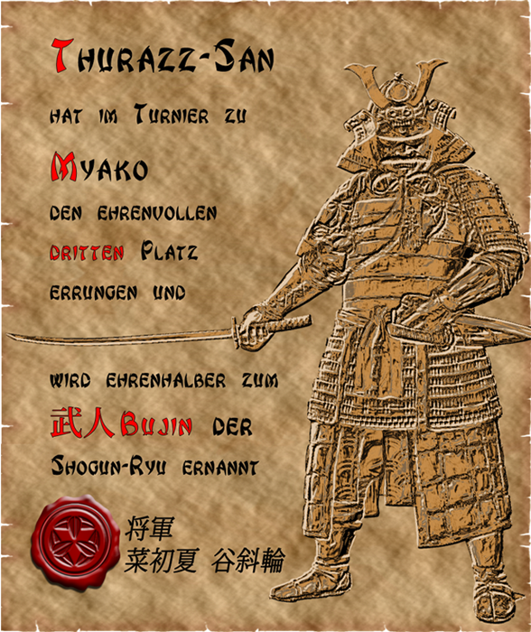 Vor dem Stall angekommen, findet er bereits einen Reiter vor, der ihn ungeduldig erwartet. In kerzengerader Haltung thront dieser auf seinem Heroida-Vollblut, die Beine in hohen Stulpenstiefeln und von weiten Pluderhosen umhüllt. Ein glänzender Kürass schützt seinen Torso und sein Gesicht verbirgt sich im Schatten eines glitzernden Morion, an dessen Seite ein roter Federbausch für Aufsehen sorgt. "Konnichi wa Yoshimura-San", begrüsst der Reiter den Mann, der sein Pferd nun anhalten lässt, da er den Hof erreicht hat. Dieser neigt sein Haupt leicht und erwidert den frühen Gruß: "Konnicha wa, di-Vincenzo-San." Dann steigt er in den Sattel, was gibt ihm auch Gelegenheit gibt, sein Grinsen abzuwenden. Der Akkzent dieses Gai-Jin erscheint dem Mann ebenso belustigend, wie seine prunkbeladene Erscheinung und die lange Nase, die wie ein Zeiger leicht abwärts geneigt, auf ein gepflegtes Spitzbärtchen verweist. Doch als er im Sattel sitzt und sein Gesicht wieder dem Fremdländer zuwendet, ist jeder Anflug eines unhöflichen Grinsens aus seinem Gesicht verflogen.