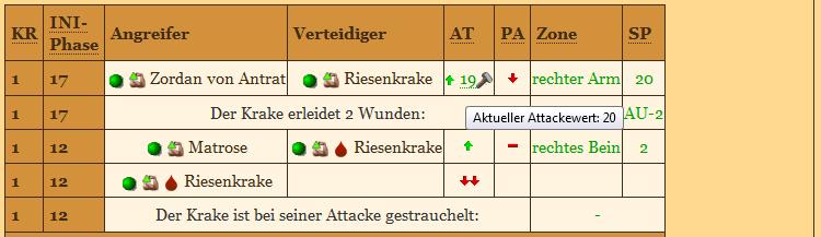 Die AT liegt bei 28, und wie man sehen kann, hole ich aus den überschüssigen AT-Punkten einen Wuchtschlag +9 raus. Nun habe ich grad im Kampf (gegen einen Riesenkraken) gesehen, dass immer noch AT 20 übrig bleibt. Wo kommt dieser eine zusätzliche Punkt her? Die AT sollte doch eigentlich bei 19 liegen?