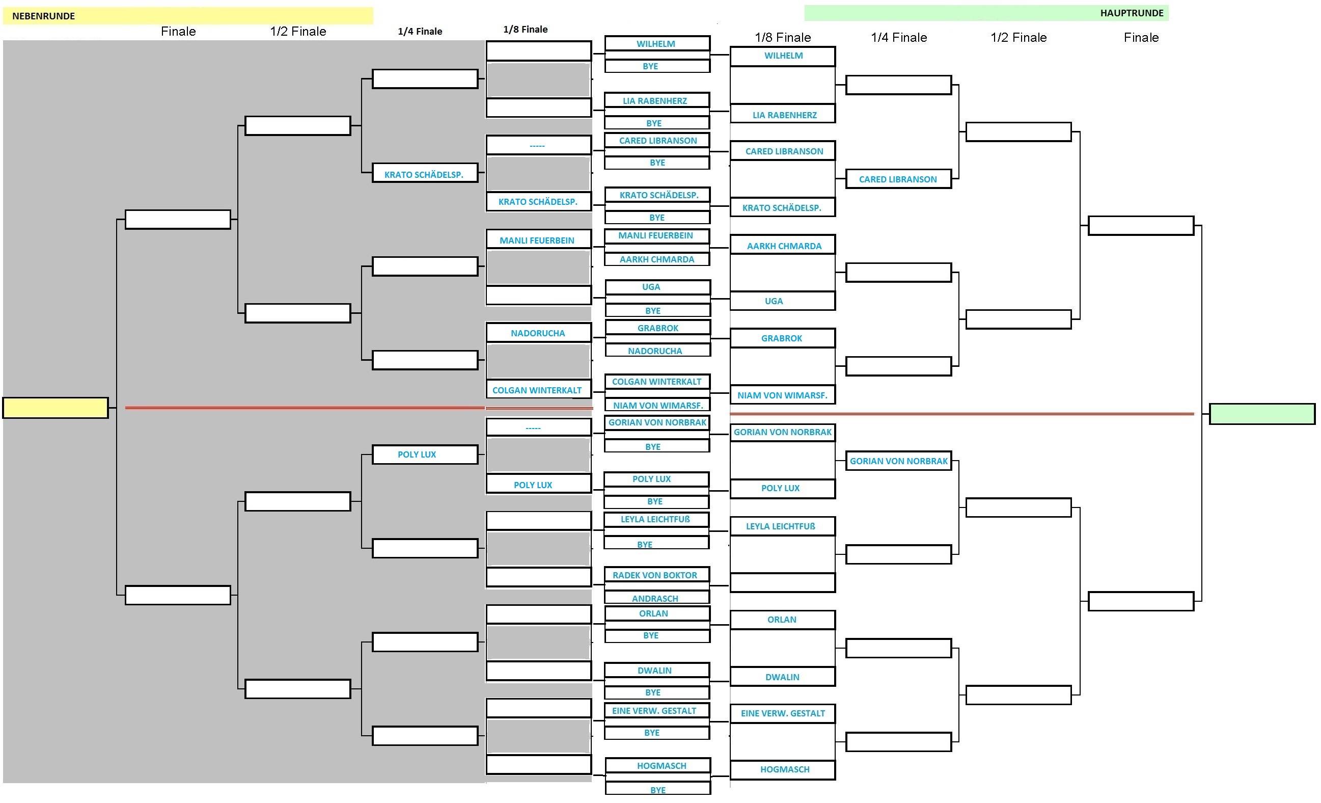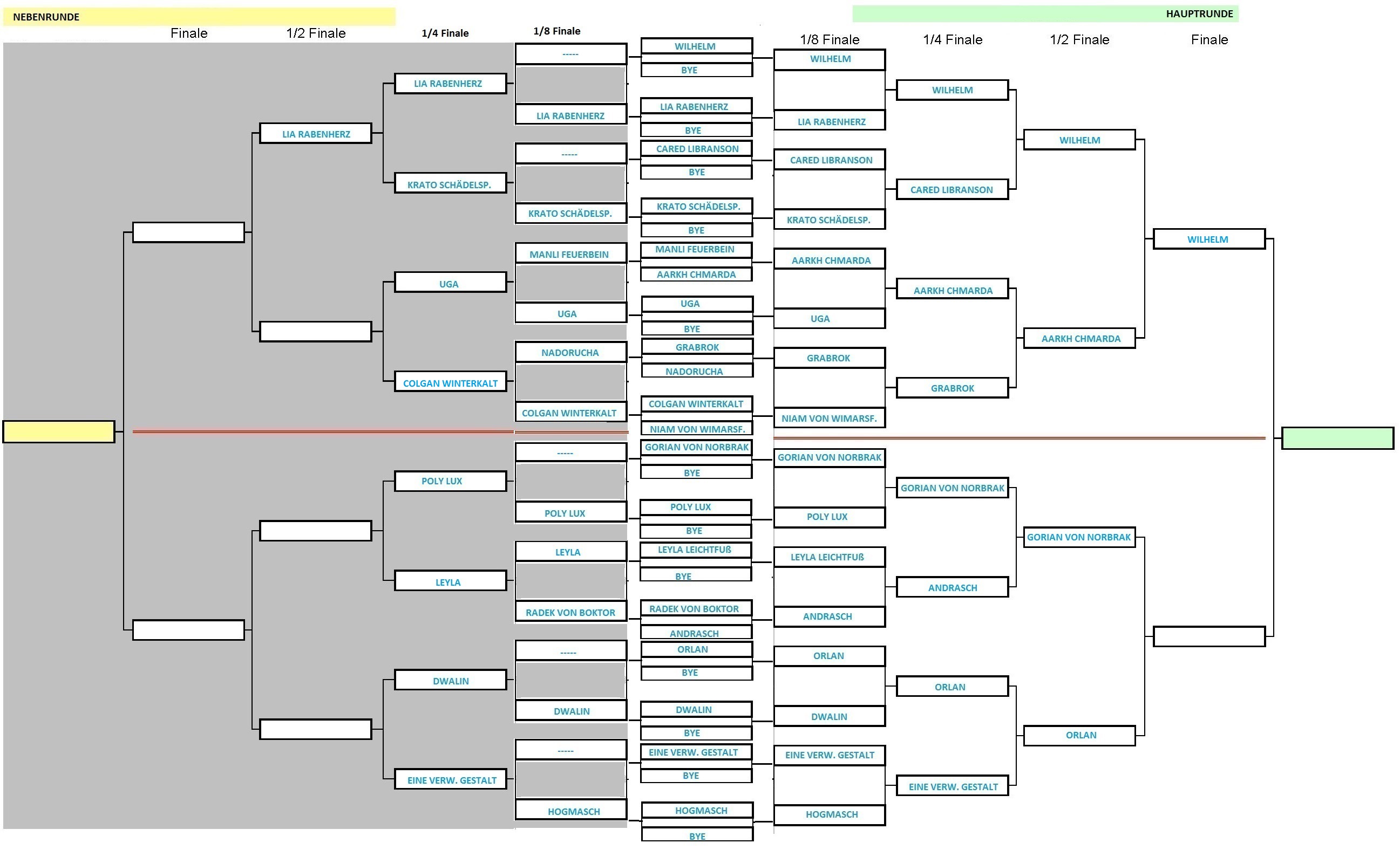 Noch ausstehend: Marius Wulfhart - Zarrak Kederk (bitte morgen (Samstag) erledigen, sonst muss ich beide disqualifizieren, weil ich zwischen den beiden sonst keinen Besserplatzierten ermitteln kann)