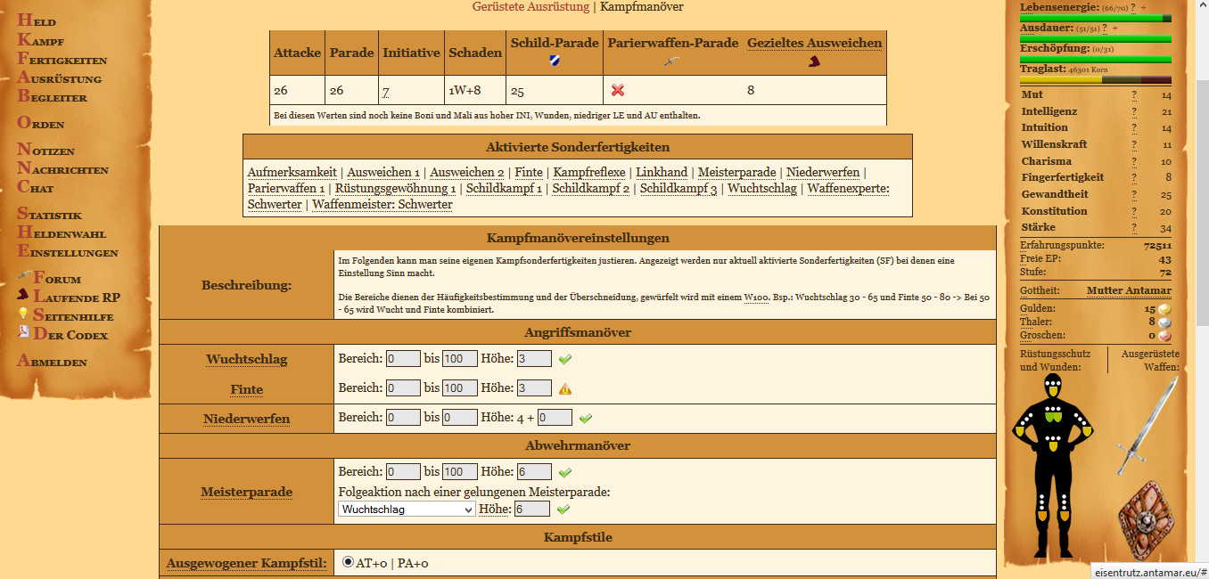Mir ist gerade aufgefallen, das bei meinem Helden PA und Schild-PA (bei Verwendung eines großen Lederschildes) gleich hoch waren (26). Zum Vergleich hab ich ihm dann ein normales Lederschild in die Hand gedrückt und nun ist die Schild-PA (25) sogar um 1 schlechter als die normale PA (26). Wie kann das sein? :denker: