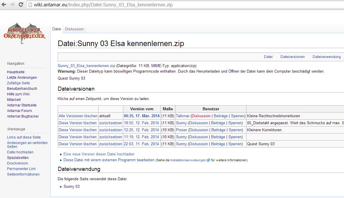 ich habe folgendes Problem: Ich kann KEINE der Zip-Dateien aus der Wiki bei Antamar öffnen. Entweder sind sie leer,oder der Ordner wird als ungültig erkannt. Ich habe Win8 und z.B. 7zip, Unzip, Gzip als Entpacker. Dieses Problem habe ich bisher nur bei Antamar. Alle anderen Zips, denen ich sonst begegnet bin, stellen kein Problem dar.