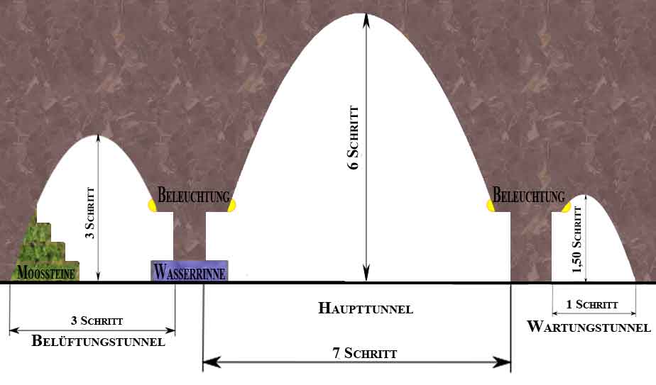 In der Mitte ist der Haupttunnel der beidseitig bereisbar ist, dabei ist er bis zu 7 Schritt Breit und erreicht eine Höhe von 6 Schritt. Kristalle die in regelmäßigen Abständen auf beiden Seiten angebracht sind, beleuchten den Haupttunnel. An der linken Wand entlang, fließt ein kleines Rinnsal aus Frischwasser, das wiederum in einem erhöhten Podest eingebettet ist. Dieses wird auch verwendet um eventuell auftretendes Sickerwasser ab- oder weiterzuleiten. Zu gleichen Teilen ist das Podest, für das Frischwasser, im Belüftungstunnel und Haupttunnel aufgeteilt. Der Belüftungstunnel ist auf der linken Seite des Haupttunnels und der größte Teil wird von dem mit Moos überwucherten Steinplateaus verbraucht. Das Grünfelsmoos ist für die Frischluft zuständig und ist bestrebt die abgestandene, verbrauchte Luft umzuwandeln. In Mitten des Wasserbettes, zwischen Haupt- und Belüftungstunnel wo das Frischwasser fließt, sind Mauerbögen, die die Luftzirkulation fördern. Es sind immer wieder große Nischen im Belüftungstunnel anzutreffen, die meist bei den Reisenden als Rastplatz benützt werden. Die Nischen sind dem Prinzip eines Erholungspark nach empfunden und diese sind des öfteren mit Bänken, Statuen, Springbrunnen, Monolithen und bis an die Decke mit Grünfelsmoos versehen.