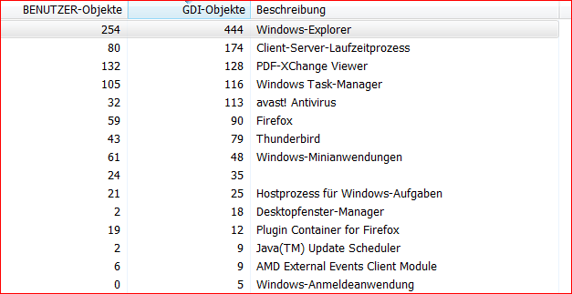 Aktiviere dann die Spalten für Benutzer- und GDI-Objekte und sortiere die Anzeige nach deren Anzahl (einfach auf die Tabellenüberschrift klicken). Damit solltest du fix den Schelm finden :-)