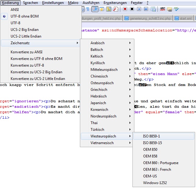 1. Zeichensatz einstellen auf ISO 8859-1 - Schon sehen die Umlaute wieder normal aus.